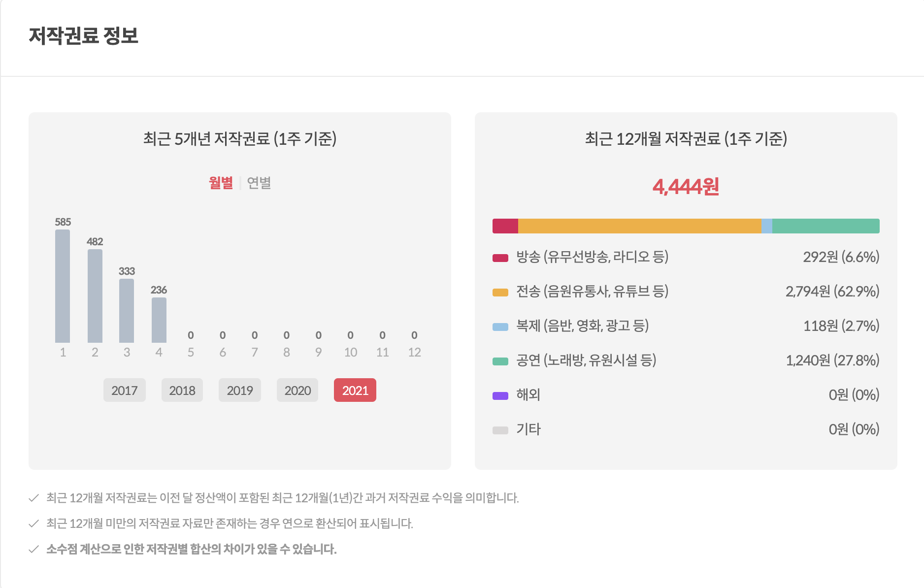 이게 얼마나 수익이 나는지 이 서비스가 얼마나 유지될지 감이 안잡혔기 때문. 아래처럼 최근의 저작권료 데이터를 보여주는데 이게 진짜 솔직한 데이터인지 플랫폼이용자들을 잡기 위한 허수 데이터가 포함된것인지 알 수가 없다.